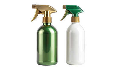 Two spray bottles, one green, one white, both with gold-colored sprayers