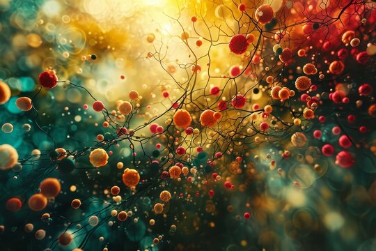 Detailed digital illustration of a molecular structure with interconnected atoms and glowing particles in a futuristic scientific background