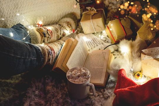 female legs in warm knitted socks on a plaid next to Christmas tree and decorations, a book and a cup of hot cocoa. atomsphere of holiday and comfort