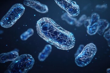 Mitochondria structure illuminated against a dark blue background showcasing their unique shape and intricate network in cellular respiration and energy production