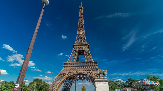 Eiffel Tower from bridge over Siene river in Paris timelapse hyperlapse, France