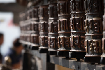 Nepal Kathmandu prayer wheel in swayambhunath temple or Monkey temple.Swayambhunath is a famous place tourist atrraction.Nepali word meaning to prayer word in buddhism