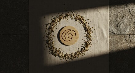 Wooden At Sign Surrounded by Dried Herbs on Textured Fabric with