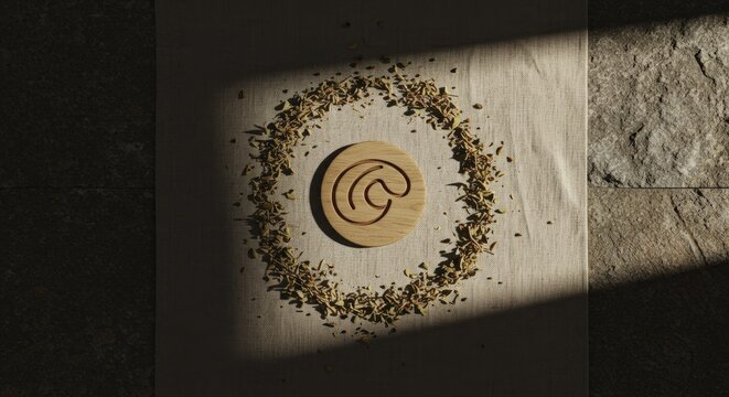 Various grains, spices and bark are arranged in a circle to resemble the "at" symbol (@) on a brown background.