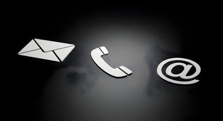 Contact us icons representing email, phone, and online communication on a black background