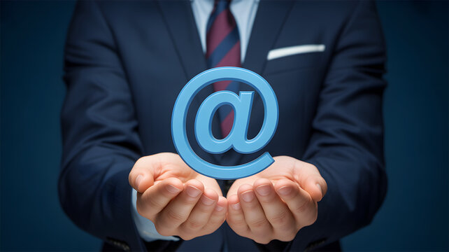 Businessman Holding @ At Sign Symbol: Email Communication, Contact Us, Digital Connection, Marketing Concept