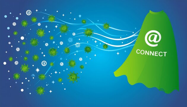 A green cape-like shape with '@ CONNECT' emitting virus-like particles and lines on a blue background, symbolizing digital spread.