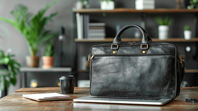 efficient workspace concept black leather briefcase holding laptop and notebook on desk against grey background