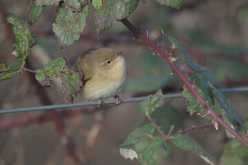 Chiffchaff,  Phylloscopus collybita, perched on a wire fence