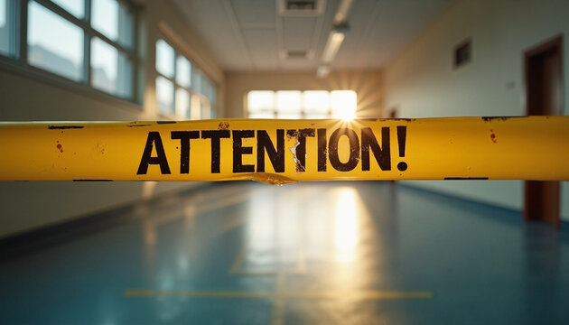 No weapons allowed. Sign with 'do not' symbol on rifle icon in front of a high school as students attend classes. Concept on gun violence, frequent mass shooting in American educational institution.
