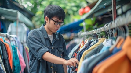 Young Asian man browsing through clothes at an outdoor market, focused and attentive.