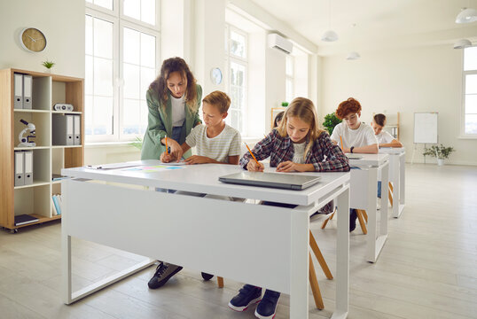 Group of children sitting at desks in the classroom and writing in their notebooks. Woman school teacher helps a student boy be more attentive while doing his test