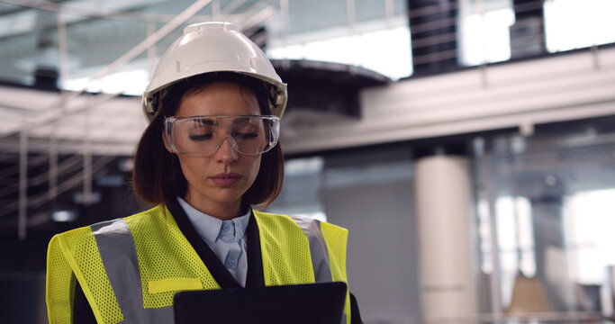 Focused factory worker using tablet in industrial warehouse