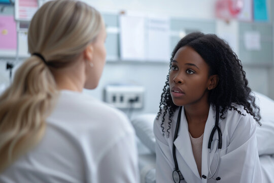 a black female doctor sitting in a ward and listening attentively to a patient complaining about her illnesses, the concept of patient care, promoting a healthy lifestyle