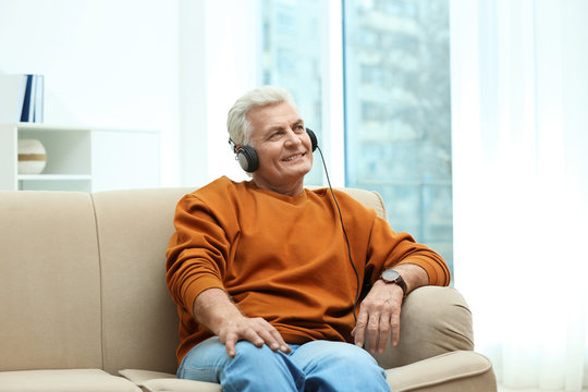 A woman wearing glasses and headphones is sitting on a couch