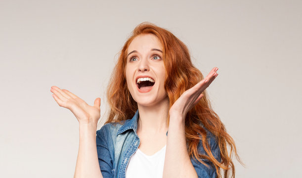 Joyful Girl Screaming In Delight On Light Studio Background