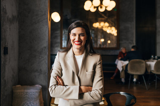 Portrait of a cheerful smiling brunette haired woman standing by the window at home