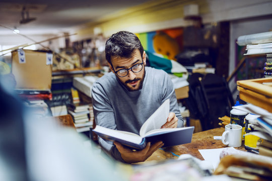 Young attractive caucasian bearded serious man with eyeglasses sitting in back of bookstore and reading interesting book.