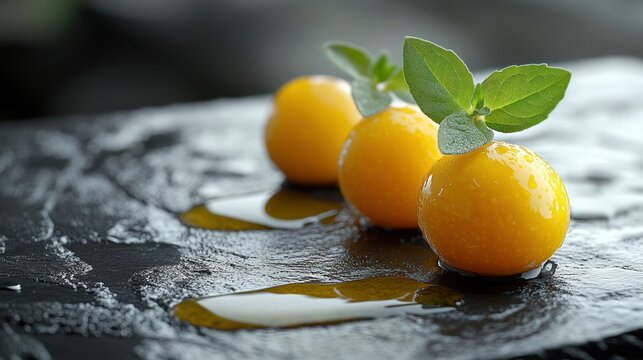 Decadent chocolate dessert with edible flowers and mint on slate plate
