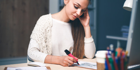 Graphic designer writing ideas in office diary