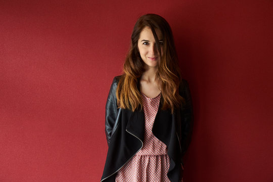 Young woman in jacket standing near red wall