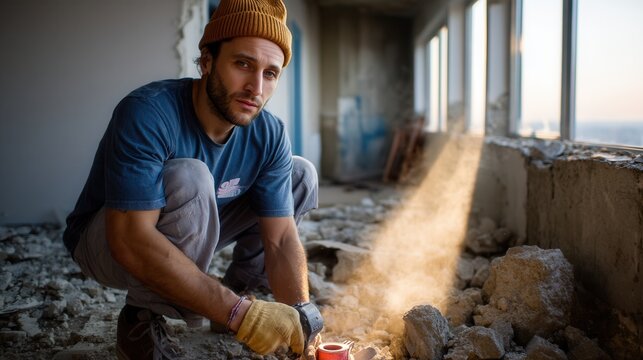 Young male construction worker installing concrete floor inside building with sunlight through windows