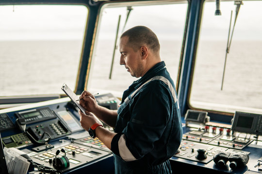 Marine navigational officer or chief mate on navigation watch on ship or vessel. He fills up checklist. Ship routine paperwork