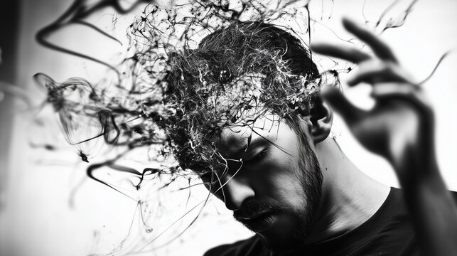 A surreal, artistic depiction of a person struggling with depression and anxiety, hands on their head, surrounded by chaotic and dark elements representing inner turmoil and overthinking.