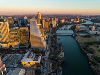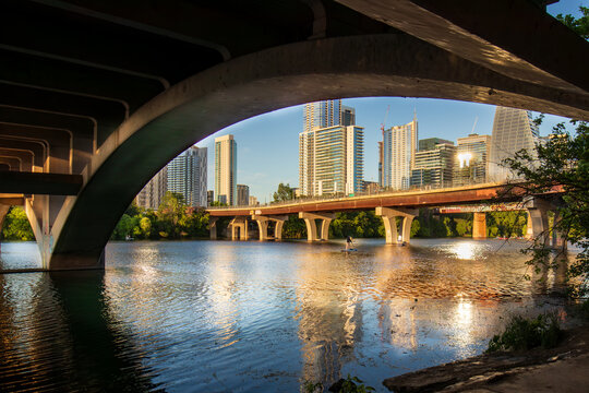Beneath the North Lamar Bridge in Austin, Texas, the tranquil waters of Lady Bird Lake mirror the golden hues of the cityscape, creating a beautiful reflection on a summer day.