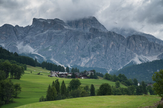 Hotels in Cortina d'Ampezzo, buildings in front of high, dramatic mountains during dramatic weather.
