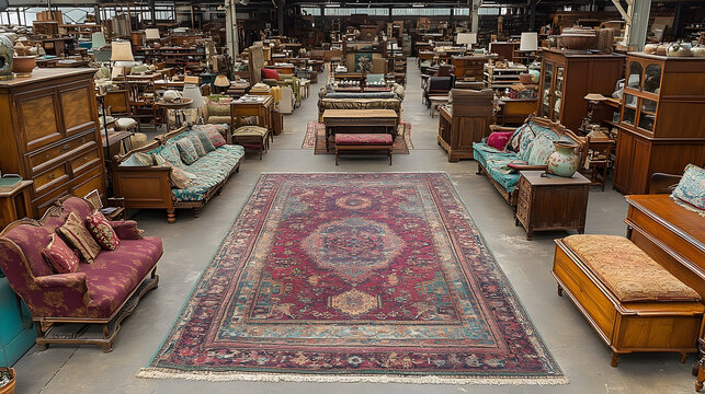 Vintage furniture shop. Second hand furniture market. Retro furniture for sale. Antique vintage store.