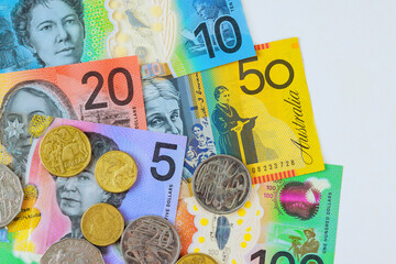 Group of colorful australian money banknote dollar (AUD) pile on white background have copyspace on top for put text