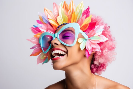 Colorful portrait of woman with feathered hairstyle and cool plastic glasses.