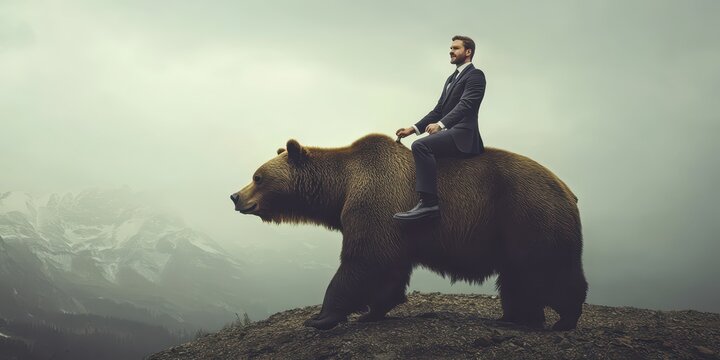 Confident businessman in formal attire riding a fierce bear against a tranquil background, symbolizing audacity and resilience in overcoming challenges.
