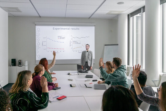 People Rising Hands To Ask Questions At PhD Thesis Defence