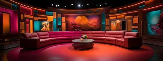A modern media room features an array of large screens showcasing various sports events and news broadcasts. The room is illuminated with vibrant blue and red colors, creating an energetic atmosphere.