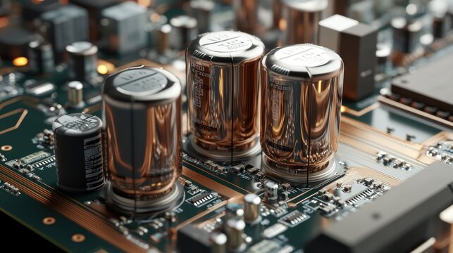 Audio amplifier circuit board, highlight capacitors, transistors and Component PCB design neatly arranged background wallpaper AI generated image