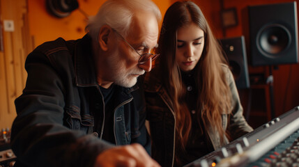 Audio engineers mastering sound in professional recording studio