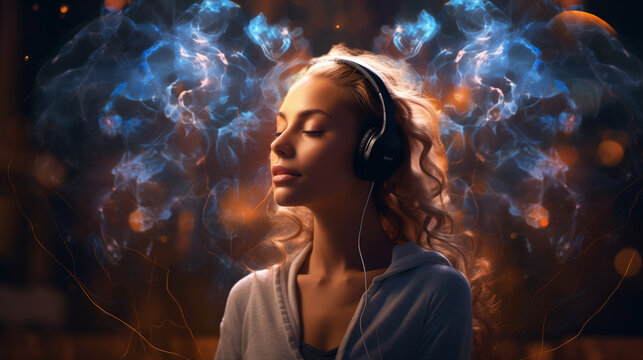 Healing Sounds and Sound Therapy. sound vibrations open, clear, and balance chakras and energy. Woman in headset in sound healing therapy and meditation