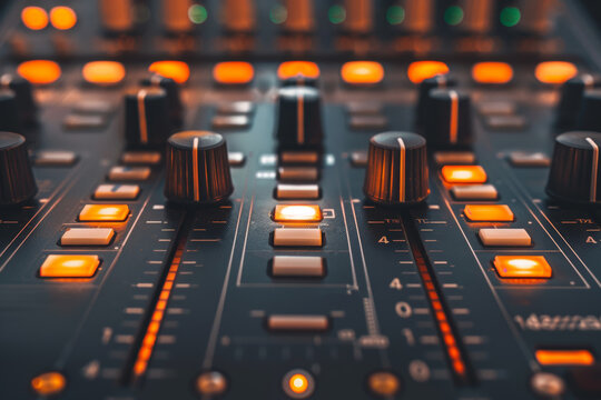Close-up of audio mixing console faders with soft lighting, showing control knobs and sliders for sound adjustment in a professional setting..