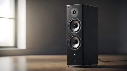 Sleek black floor-standing audio speaker delivering pristine sound in a modern home interior, symbolizing premium listening and contemporary living