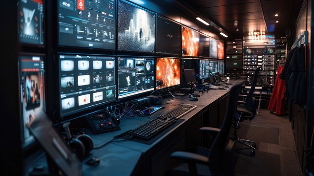 A neon-lit studio filled with surreal screens showcasing various content creation tools, illuminated by electric blue lights.