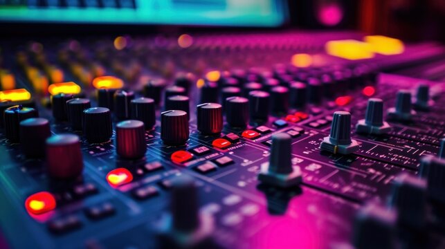 Close-up of a professional audio mixing console with illuminated controls and knobs for sound engineering and music production in a studio setting
