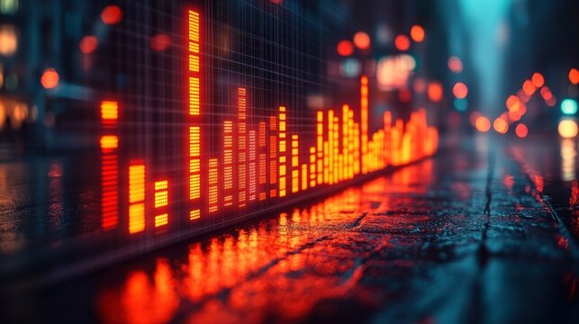 Glowing digital audio equalizer display reflecting on a rain-slicked city street at night.