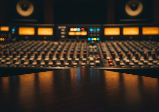 Closeup of a professional audio mixing console in a dimly lit recording studio with glowing vu meters for commercial usage and mockups