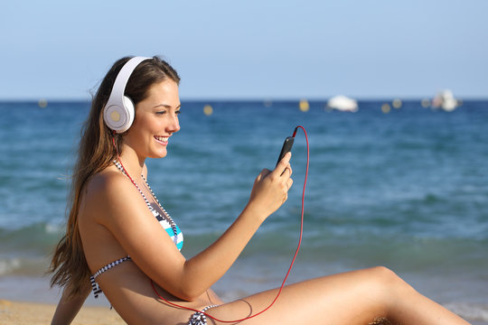 Portrait of young Caucasian pretty woman wearing headphones and contemplates ancient artefacts. Student visiting arts exhibition. Concept of culture education