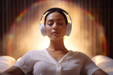 Serene woman wearing headphones with colorful sound waves emanating, symbolizing immersive audio experience, music therapy, and mental relaxation.