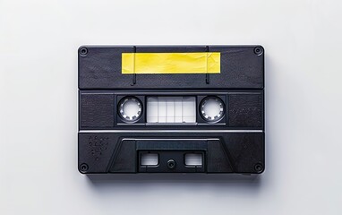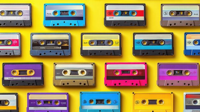 Vintage yellow audio cassette on bright yellow background. Audio cassettes with magnetic tape. Vintage audio recording storage and playback tools. Music concept. Retro