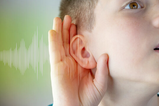 Closeup caucasian small childs ear, sound wave, Hearing Test, ringing or buzzing sensation, Auditory impairment, tinnitus, Inflammation middle ear, acoustic trauma
