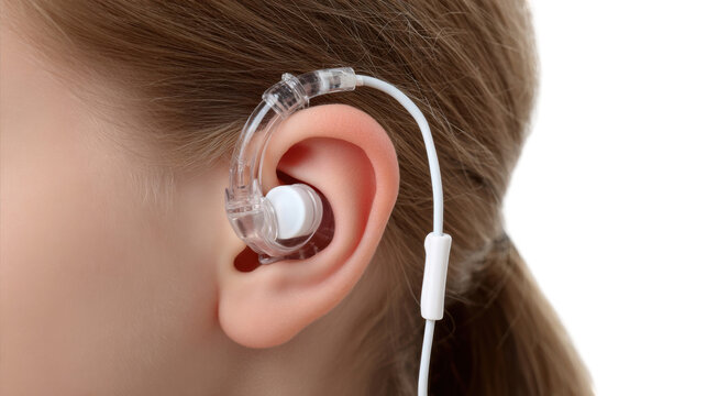 Close up of a patient's ear with headphones during a hearing test, highlighting the process of audiometry and diagnosis of hearing related problems on a transparent background